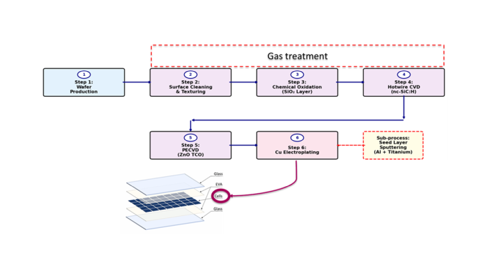 Interestingly, SiLEAN-specific process steps account for only 6% of the total baseline impact. Within that share, the formation of copper metallization, the deposition of nc-SiC:H, and the creation of ZnO layers are identified as the most influential contributors. The analysis also highlights that electricity consumption and compressed air are critical contributors, underscoring the importance of energy-efficient production and clean energy sourcing. This sensitivity to the energy mix will be a key consideration as processes move toward industrial scale.